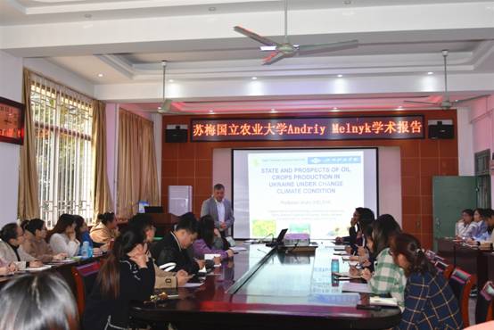 AndriyMelnyk教授详细介绍了乌克兰的气候、土壤、农作物产量以及乌克兰的气候变化情况,他指出乌克兰良好的土壤和后勤保障条件使乌克兰油料作物在全球市场上具有很强的竞争力。报告会后,他与参会教师和学生进行了深入交流,并欢迎我校学生去乌克兰继续深造。