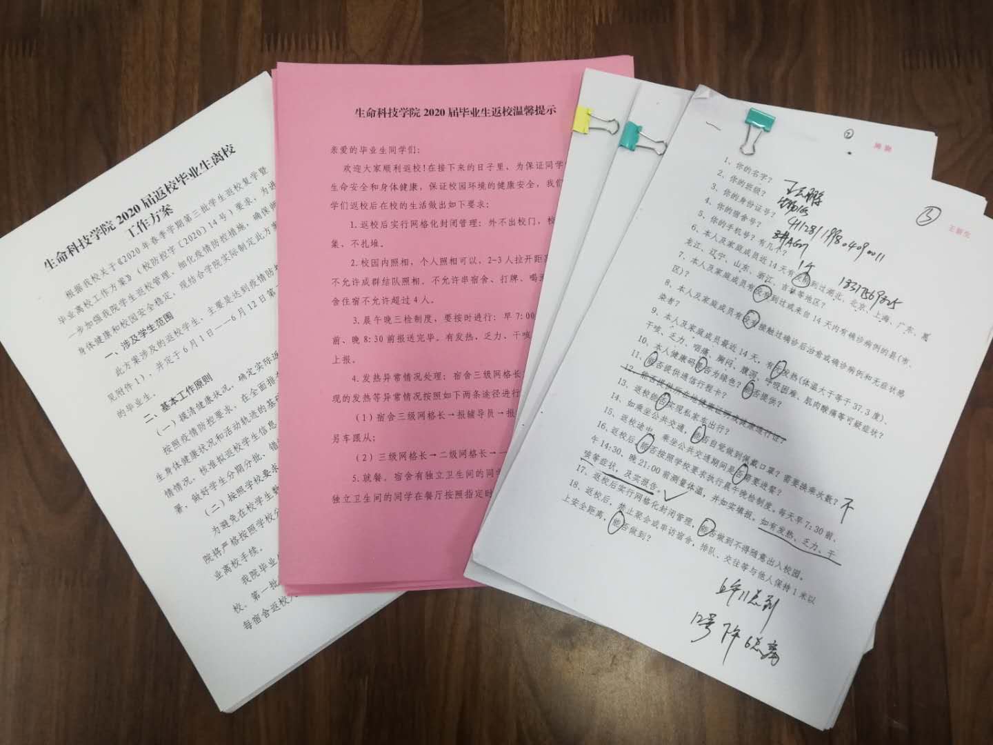 根据疫情防控相关要求,我院成立返校复学工作工作组,制定《生命科技学院2020届返校毕业生离校工作方案》,强化责任担当,狠抓工作落实。通过对近14天钉钉打卡数据重点字段逐一严格筛查,506名毕业生中有310名同学具备返校资格。对于196名不能返校的毕业生,辅导员老师一一进行电话沟通,进行心理疏导。通过讲解相关政策,解决后顾之忧,使得学生情绪得以安抚,同学们纷纷表示理解并支持学校防控工作。此外,依托电话录音和随即记录的方式对310名具备返校资格的毕业生进行复学前的二次确认,建立一人一档健康台账,确保返校工作准确无误。