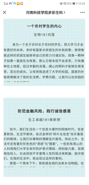 通过精心安排和布置,在全院学生中开展“树立诚信观念防范金融风险”主题征文比赛。学院初赛共收到征文40篇,经过评选,共推荐优秀作品15篇参与学校比赛。最终我院种科184班张倩倩同学荣获校“树立诚信观念防范金融风险”主题征文比赛一等奖,生科181班窦祥龙、生物182班任艺菲荣获校“树立诚信观念防范金融风险”主题征文比赛三等奖。本次征文活动进一步提高了大学生珍爱信用、理性借贷及诚信感恩意识,引导学生树立正确的价值观和消费观。
