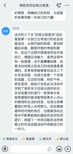 各实践队员结合学习和实践内容依次进行交流发言。队员们分享了实践过程中的感人瞬间和自己的成长收获,绿色百农垃圾分类宣讲小队的队长白雨分享感悟时表示:“垃圾分类,举手之劳,功在当代,利在千秋。从前的我只是把垃圾分类当做口号,未真正落实,经过这次实践活动,我才深切体会到垃圾分类对于我们的重要性。垃圾分类可以减少污染、节约资源,还可以培养大家环境保护的意识。”