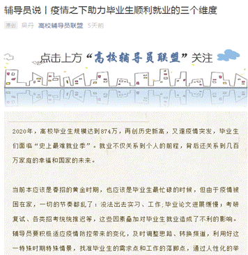 4月12日,高校辅导员联盟微信客户端刊发我院辅导员吴丹老师题为《辅导员说|疫情之下助力毕业生顺利就业的三个维度》的投稿文章,主要介绍了吴丹老师就疫情期间如何加强毕业生就业工作的思考和计划举措。