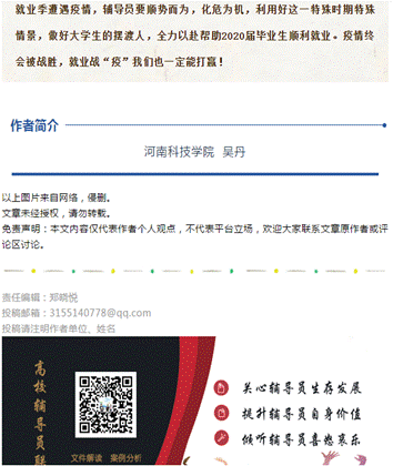 就业季遭遇疫情,辅导员要顺势而为,化危为机,利用好这一特殊时期特殊情景,做好大学生的摆渡人,全力以赴帮助2020届毕业生顺利就业。疫情终会被战胜,就业战“疫”我们也一定能打赢!