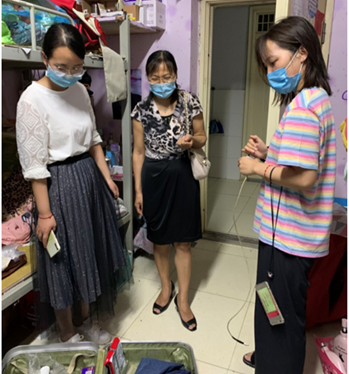 根据学院2020届毕业生返校工作安排,截止6月1日下午6点,经管学院首批64名毕业生顺利完成返校工作。为实地掌握毕业生返校后的生活及思想动态,表达学院对2020届毕业生的深情牵挂和美好祝愿。6月1日晚7点半,我院党委书记刘刚,院长闫秀敏,副院长郎群秀、张宏军、崔鸽,组织员吴丹和全体辅导员对八号楼、九号楼首批返校的41个宿舍、64名毕业生逐一进行走访,亲切看望慰问毕业生。