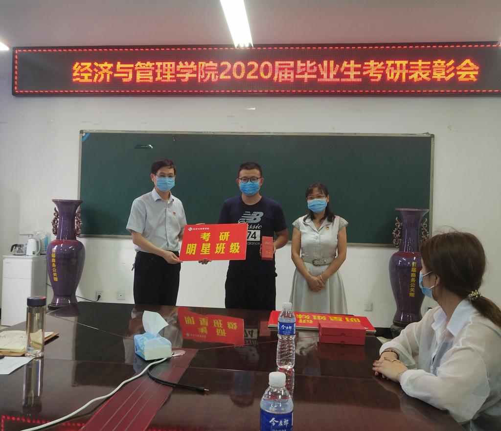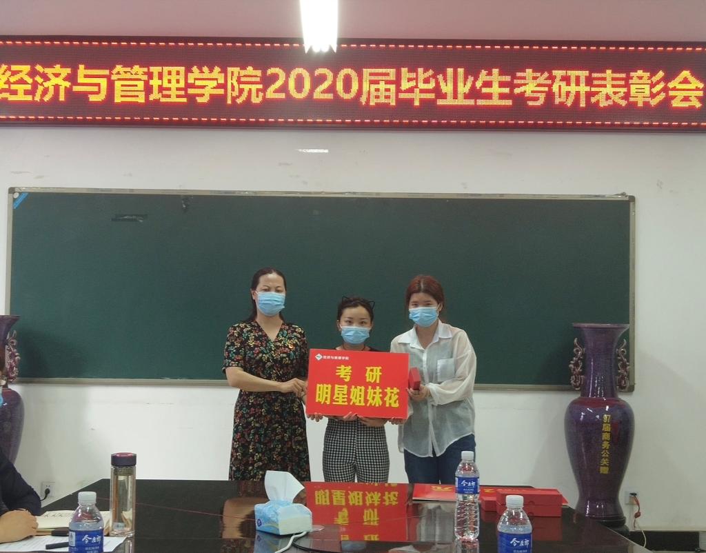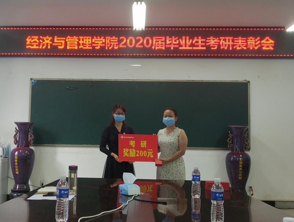 与会领导为2020届毕业生中考取研究生的个人颁奖,给予每人200元的考研奖金以资鼓励。对涌现出的“考研明星班级”代表人资161班、人资162班和“考研姐妹花”代表侯玉莹、张子月等颁奖并发放纪念品。