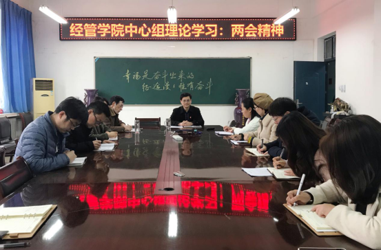 3月18日下午,经济与管理学院于10号楼202会议室召开党委中心组理论学习会议,专题学习“两会”精神。学院党委书记何二毛、党委副书记吴丹、副院长郎群秀、副院长崔鸽、科级干部代表及全体辅导员参会。