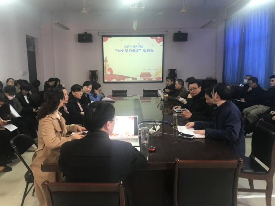 3月25日下午,经济与管理学院在10号楼202会议室召开党史学习教育动员会。学院党委书记何二毛,党委副书记吴丹,副院长郎群秀、崔鸽,全体教师40余人参加会议。会议由副院长郎群秀主持。