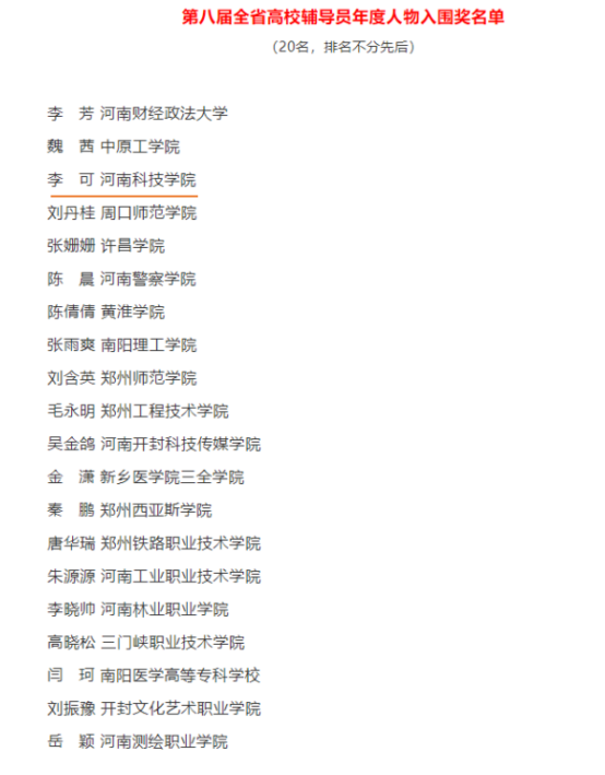 根据《中共河南省委高校工委河南省教育厅关于组织开展“第八届全省高校辅导员年度人物”“第十三届全国高校辅导员年度人物”暨“2021年最美高校辅导员”推选活动的通知》豫高发〔2021〕96号)要求,经学校推荐、材料评审、网络答辩、综合评议等环节,我院团委书记、辅导员李可荣获“第八届全省高校辅导员年度人物”入围奖。