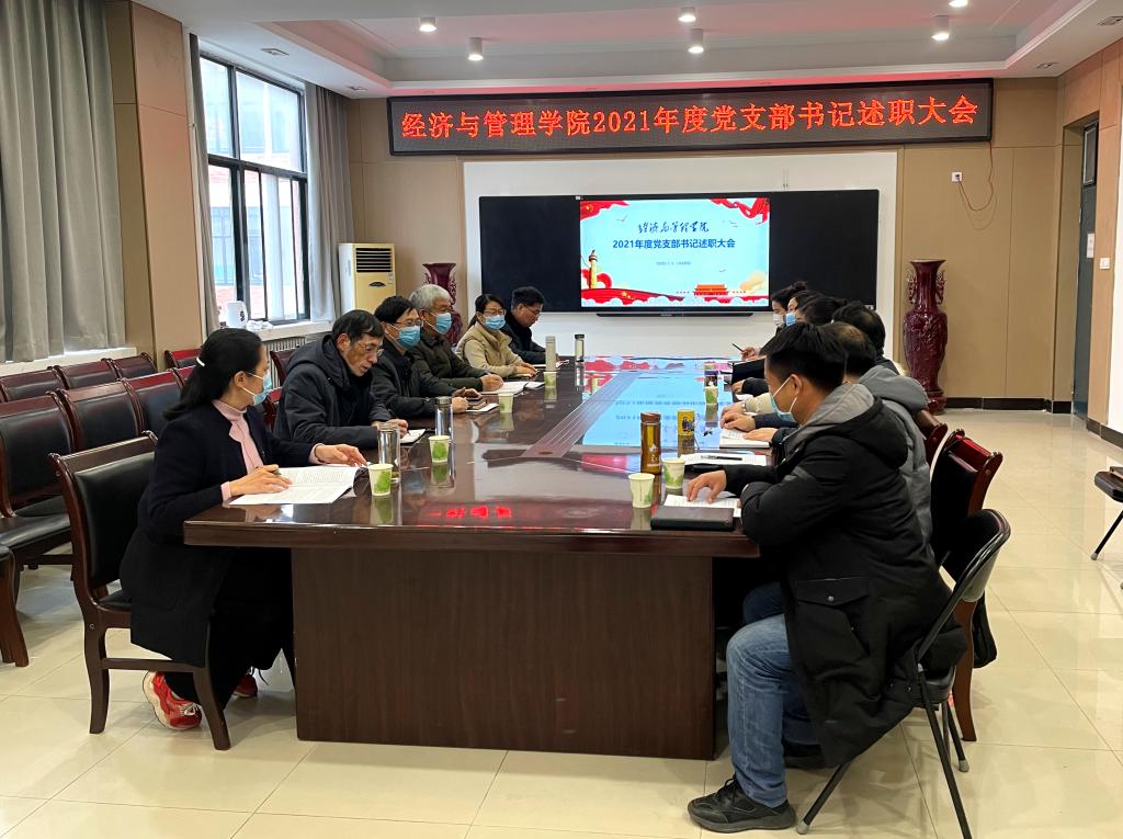 根据校党委组织部《关于开展2021年度党支部书记抓党建述职和党支部“双评议”工作的通知》要求,1月5日下午,经济与管理学院在10#202会议室召开2021年度党支部书记述职大会。学院联点组织员叶孟韬,学院党委委员、各党支部书记及党员代表等参加了会议。会议由院党委副书记吴丹主持。