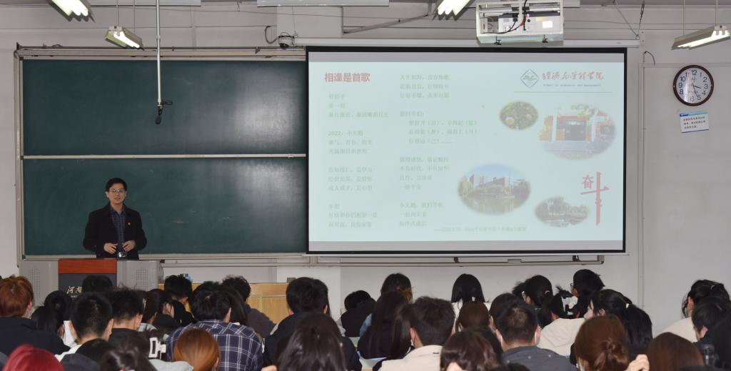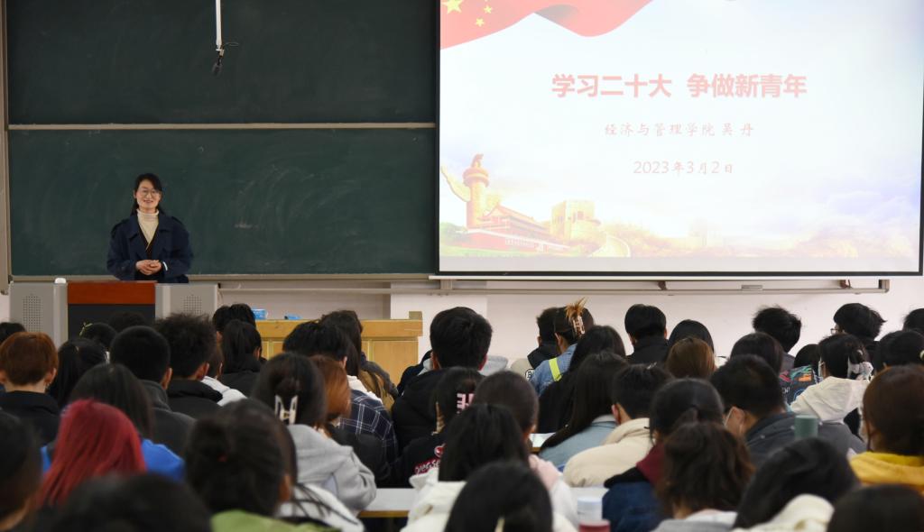 深入贯彻习近平新时代中国特色社会主义思想,学习贯彻党的二十大精神,激励广大学生踔厉奋发、勇毅前行、敢于担当、积极作为、奋进新征程,3月2日下午,经济与管理学院党委书记何二毛、副书记吴丹在10号楼合五教室,为学生讲授2023年春季开学第一课,学生代表204人聆听本次授课。
