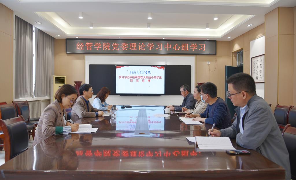 5月4日上午,经济与管理学院党委理论学习中心组专题学习贯彻习近平总书记给中国农业大学科技小院的同学们的回信精神。学院中心组成员参加会议,院党委书记何二毛主持会议。