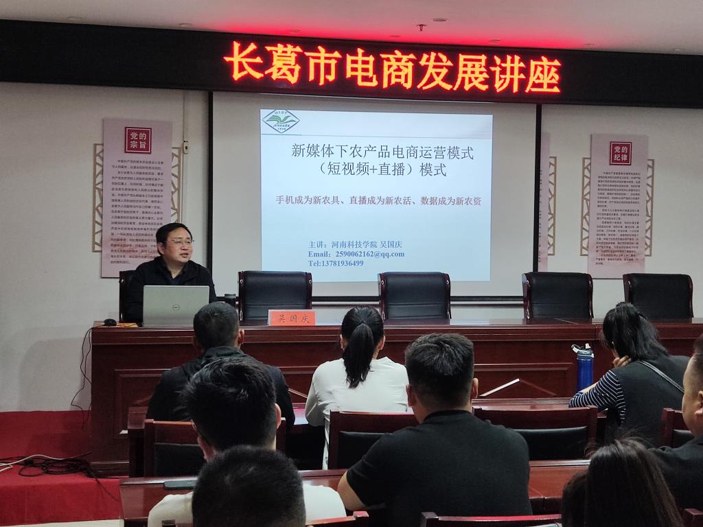 调研结束后,科技帮扶团队分别到长葛市商务局和许昌市经开区开展科技帮扶服务工作。在长葛市商务局,吴国庆面向来自电商运营一线的蜂产品、融媒体、农民专业合作社的50余位企业和农民代表做了关于新媒体环境下农产品电商运营模式的主题报告。在许昌市经开区张联锋做了关于中国电子商务的发展和农产品电子商务模式的主题报告,以及如何做好农产电商进行了专业指导。专家通过短视频、平台直播、电商运营模式和营销管理等方面讲座,深入剖析农村电商发展趋势,进一步提升所帮扶地区和电商企业的电商应用水平和实操技能,拓宽产品销售渠道。