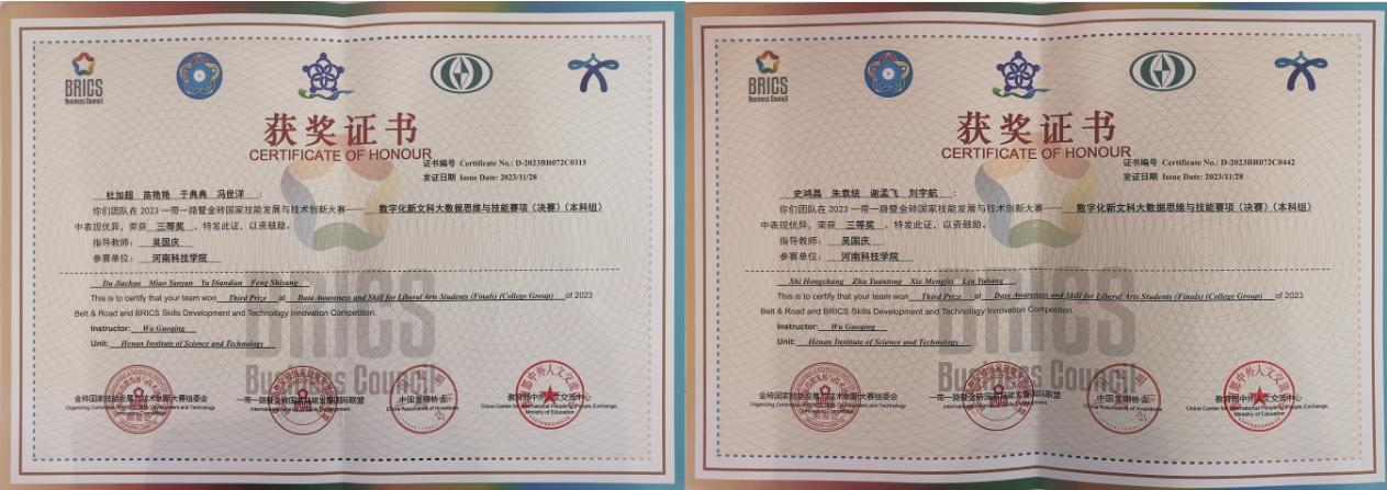 近日,第七届一带一路暨金砖国家技能发展与技术创新大赛“数字化新文科大数据思维与技能”竞赛国内总决赛在郑州闭幕。本项赛事从6月1日开始启动,历时6个月,吸引全国500多所院校1600多支赛队7000多名师生参赛。经济与管理学院两支参赛队,在吴国庆老师的精心指导下,积极参与,发挥专业优势,认真准备,经过全国预赛与决赛两轮选拔,在全国总决赛中获得2项三等奖。