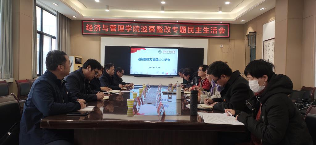 12月26日下午,经济与管理学院在10号楼202会议室召开巡察整改专题民主生活会,第五轮校内巡察第一巡察组组长高扬帆,巡察工作办公室主任樊跃峰,党委组织部副部长陈利,纪委(监察专员办公室)第一纪检监察室主任李岩,巡察组联络员、党委统战部副部长雷晓环到会指导。会议由学院党委书记何二毛主持。