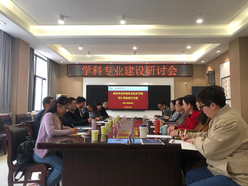 交流会上,院长罗士喜首先对河南牧业经济学院一行来我院交流表示热烈欢迎,并回顾了他在河南牧业经济学院工作时的历程,分享了在工作中的宝贵经验与领导艺术。执行院长崔鸽对我院的发展历程、专业建设、人才培养等进行介绍。河南牧业经济学院物流与电商学院院长曹献存介绍了物电学院在提升办院特色、凝练专业方向,争取横、纵向项目等方面取得的成绩和形成的特色。李光院长对经贸学院的人才培养及专业建设等进行介绍,并对硕士生联合培养提出设想。随后,与会人员就党建引领、业务融合、专业建设与转型、实验室建设等问题进行了深入探讨。