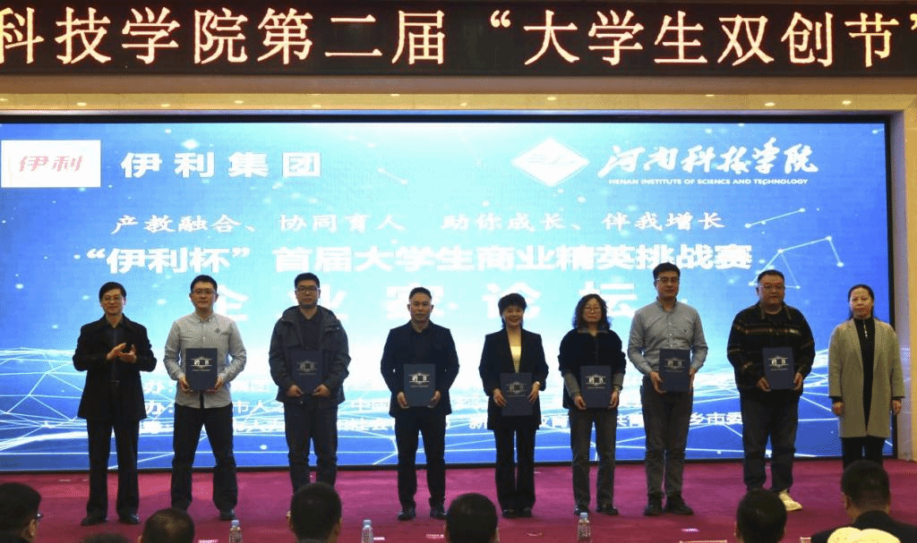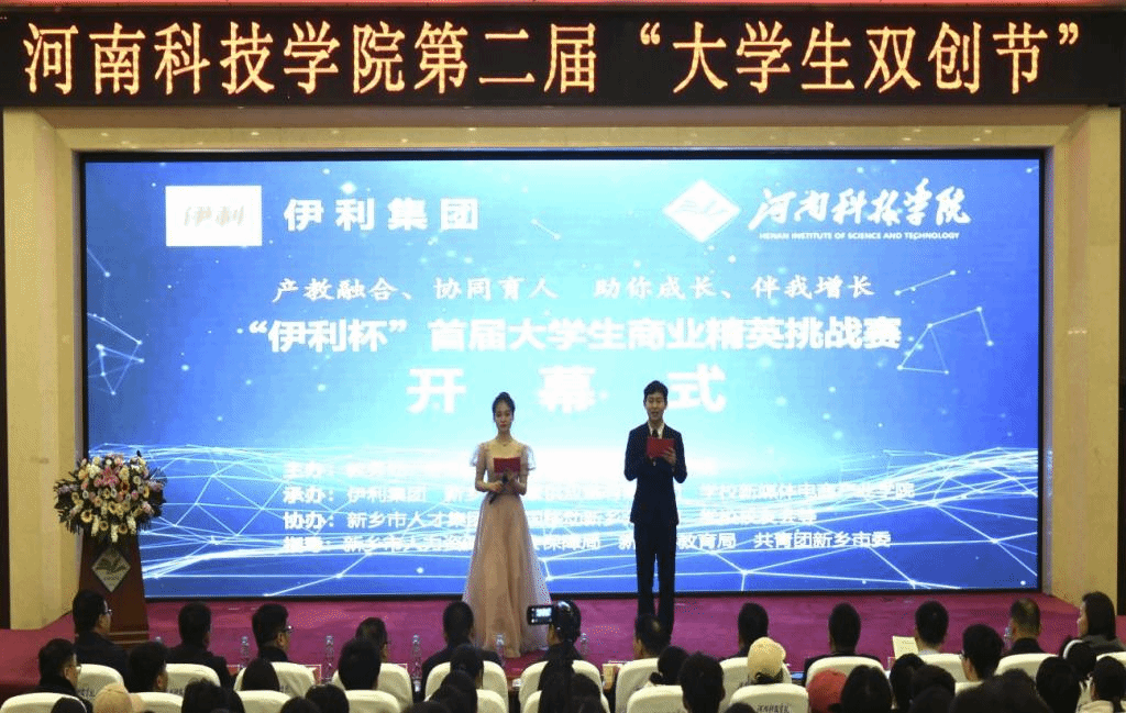 3月13日下午,第二届大学生“双创节”暨“伊利杯”首届大学生商业精英挑战赛开幕式在行政楼308报告厅隆重举行。校党委副书记、工会主席姚刚,新乡市人力资源和社会保障局副局长杨焱、共青团新乡市委副书记贾紫亮出席开幕式。伊利集团、新乡人才集团,中国移动、中国平安、中国人寿、广发银行、中国银联等驻新分公司,新乡新之蒙供应链有限公司、三维圈数科集团、新乡云妹集团、新乡万融连环境科技有限公司等10余家合作企业、校友企业负责人,我校相关部门负责人以及师生代表300余人参加开幕式。
