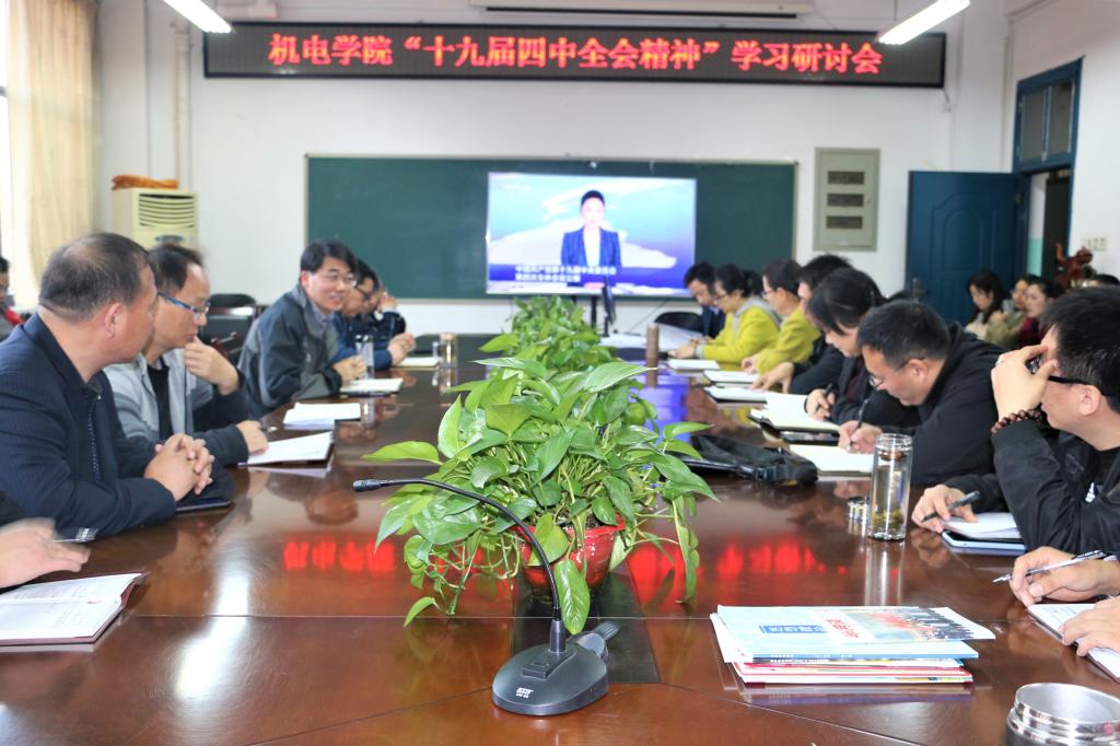 11月14日下午,机电学院党委组织全体教职工在4304会议室学习研讨党的十九届四中全会精神。