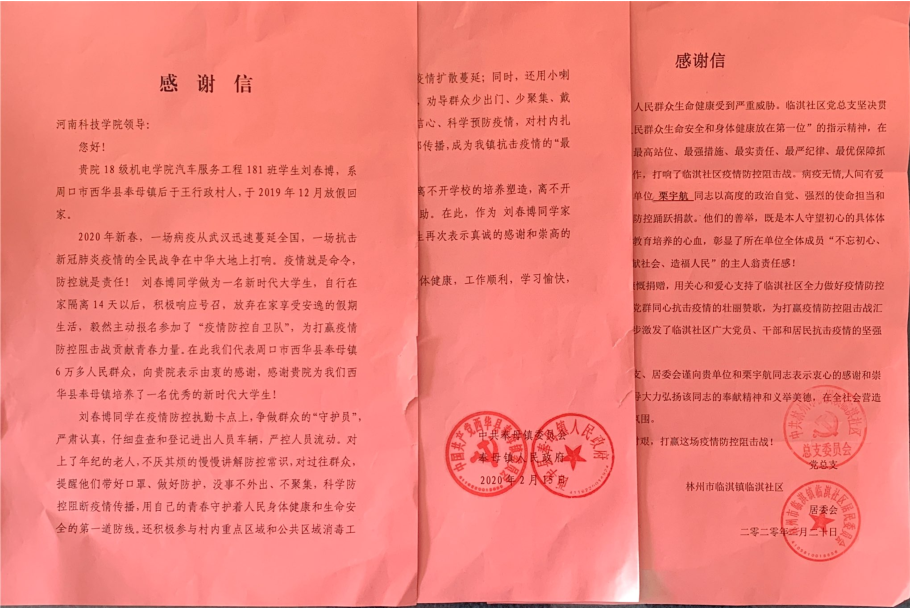 第一封感谢信来自汽车服务工程专业181班刘春博的家乡西华县奉母镇。信中说刘春博同学在疫情爆发的二月份积极响应党的号召,放弃在家享受安逸的假期生活,毅然主动报名参加了镇里组织的“疫情防控自卫队”。他主要负责在疫情防控执勤卡点检查登记进出人员车辆和村内重点区域和公共区域消毒工作。同时,他还通过小喇叭和发放宣传防控手册的形式为大家讲解新冠肺炎的定义,新冠肺炎如何传播以及如何有效预防。对于不认识字的老人,他用地道的家乡话和肢体动作让老人明白。这有效的减轻和消除了村民的恐慌和对新冠肺炎病毒的误解,引导群众增强信心,坚定必胜的信念。信中赞扬刘春博同学身为新时代大学生,面对疫情,勇敢面对挑战,并以强烈的责任感和使命感为疫情防控工作贡献了一份力量。