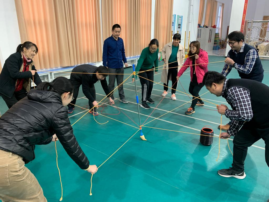 在王老师的引导下,教职工们兴致盎然地陆续开展了“五毛一块”、“玫瑰花开”、“一圈到底”“解千结”“神笔马良”等活动。