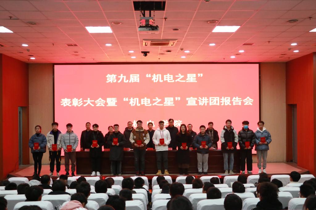 机电学院副院长孔晓红宣读了《关于表彰机电学院第九届“机电之星”的决定》。学院学生工作领导小组通过德、能、勤、绩四个方面考核,经个人申报、网络投票、民主推荐、团委审核以及机电学院党政联席会议研究决定等程序,在候选人中评选出张钰莹等12名同学为第九届“机电之星”。出席大会的领导为受表彰的“机电之星”颁发证书,并合影留念。