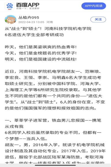 【百度APP】《从“战士”到“硕士”!河南科技学院机电学院6名退伍大学生全部考研成功》