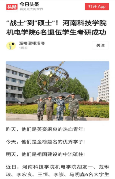 【今日头条】《从“战士”到“硕士”!河南科技学院机电学院6名退伍大学生全部考研成功》