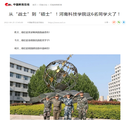 【中国教育在线】《从“战士”到“硕士”!河南科技学院机电学院6名退伍大学生全部考研成功》