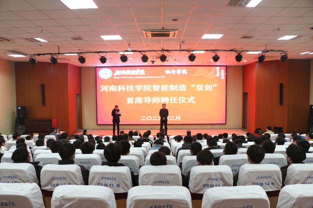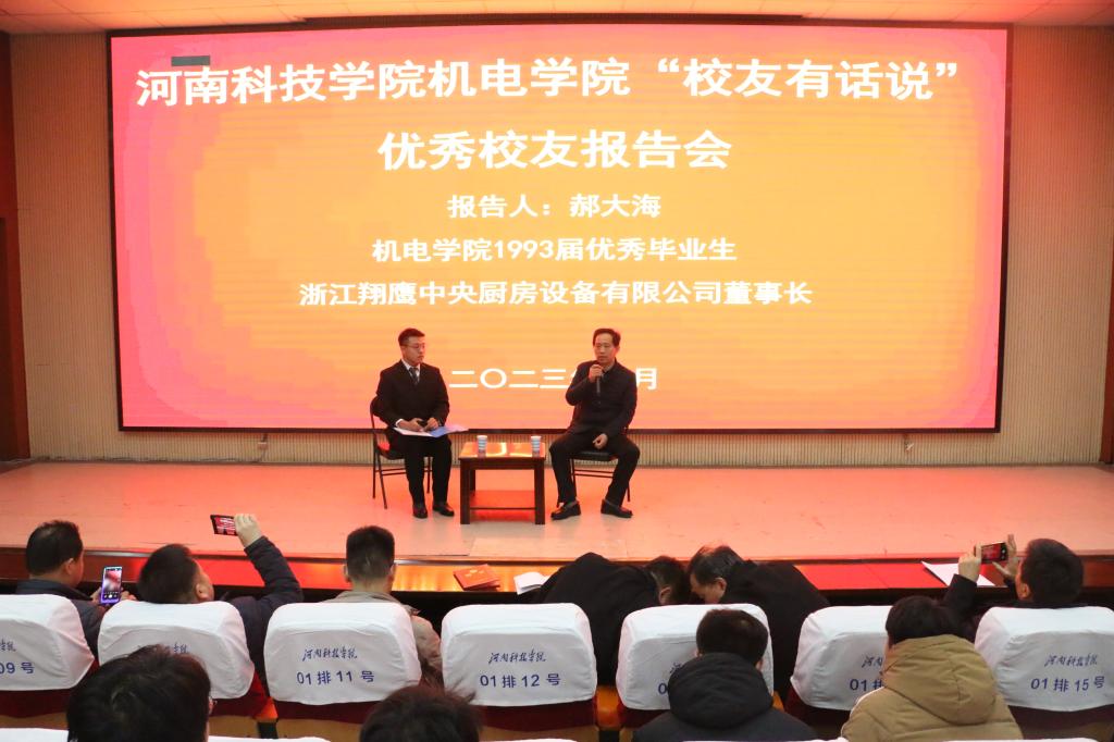 为进一步提高教育教学质量,为学生的成长成才营造良好的育人环境,增强全院学生学习的积极性和主动性,推动良好院风的形成,按照《机电学院学风建设月系列活动方案》要求,2月22日上午,机电学院在图书馆一楼报告厅召开智能制造“双创”首席导师聘任暨优秀校友报告会。会议邀请机电学院1993届优秀校友郝大海(浙江翔鹰中央厨房设备有限公司董事长)作报告,机电学院全体党政班子,校长办公室副主任、校友办主任刘弘,教师代表及200余名学生参加了报告会。会议由学院党委书记樊跃峰和学生代表董雨辰分阶段主持。