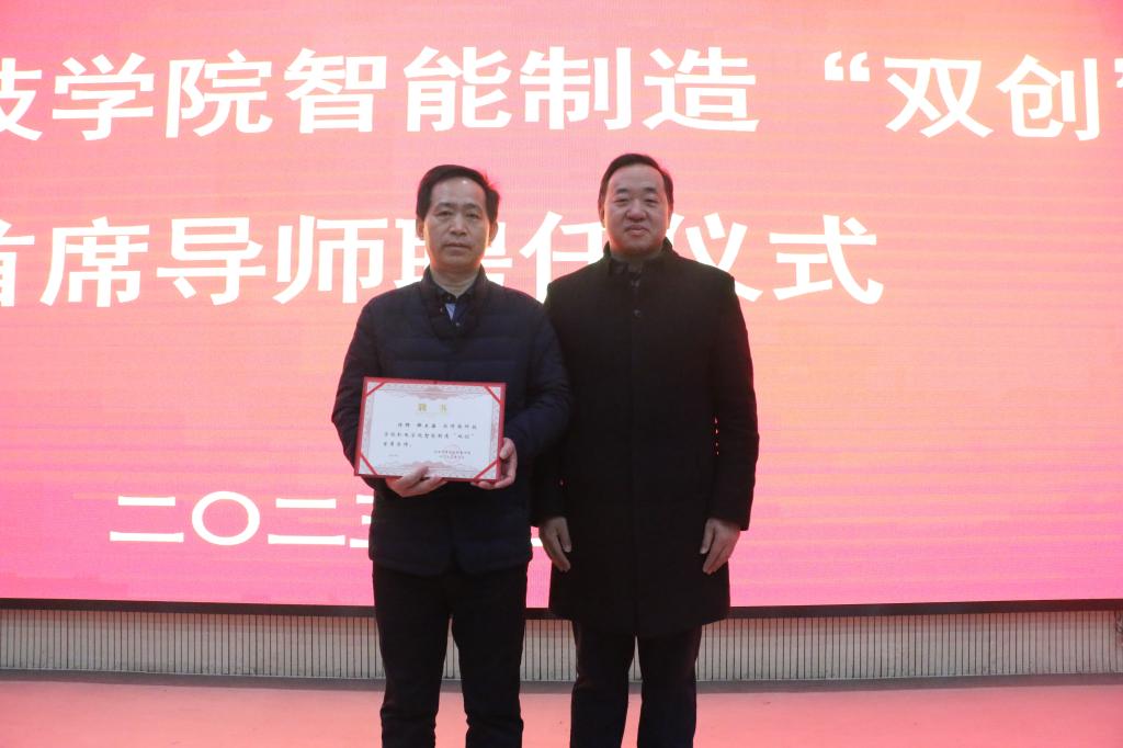 会议伊始,樊跃峰宣读《机电学院关于聘任郝大海优秀校友为智能制造“双创”首席导师的决定》。随后,院长聂福全为郝大海颁发了聘书。