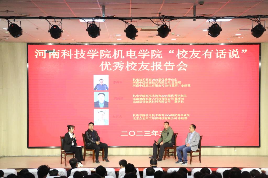 为进一步提高教育教学质量,为学生的成长成才营造良好的育人环境,增强全院学生学习的积极性和主动性,推动良好院风的形成。3月2日下午在图书馆一楼报告厅召开机电学院智能制造“双创”首席导师聘任暨优秀校友报告会,会议邀请机电学院2003届优秀校友张海洲(河南中煤钻探钻具有限公司总经理)、2004届优秀校友高俊强(芜湖德海机器人科技有限公司董事长)、2006届优秀校友赵其光(北京众志天工环保科技有限公司总经理)作报告。机电学院全体党政班子、校长办公室副主任、校友办主任刘弘、教师代表及200余名学生参加了报告会。会议由学院党委副书记李印和学生代表郭仪分阶段主持。
