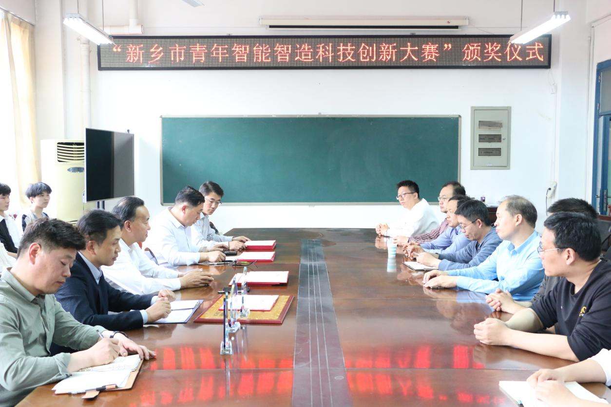 近日,由共青团新乡市委发起,中共新乡市委统战部、新乡市科技局、新乡市工信局、新乡市人社局联合主办的首届“新乡市青年智能制造科技创新创业大赛”在新乡市科技大市场战略研究院举行。4月18日下午,新乡市科技大市场战略研究院黄云鹏院长在我校机电学院4304会议室为学院获奖教师及学生代表进行了颁奖。机电学院在此次大赛中取得了优异成绩,获特等奖1项、一等奖2项、二等奖3项、三等奖5项,机电学院获得优秀组织奖。