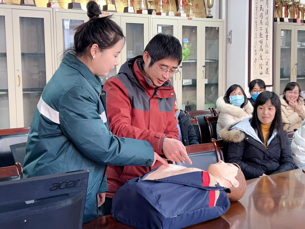 培训会上,任蕊进行了健康知识宣讲,通过播放视频展示了心肺复苏的工作机制,并强调了心肺复苏操作的关键要点。视频播放完毕后,任蕊及其助手通过假人为大家示范了急救操作,演示结束后,我院两位老师也积极尝试,在假人身上进行了了心肺复苏的模拟演练。之后,任蕊又介绍了海姆立克急救法,并针对不同年龄阶段讲解了海姆立克急救法的操作要点。讲解结束后,任蕊及其助手为大家做了操作示范。