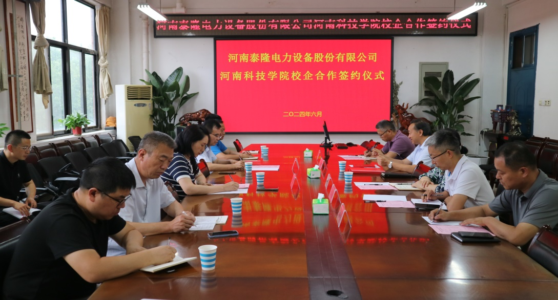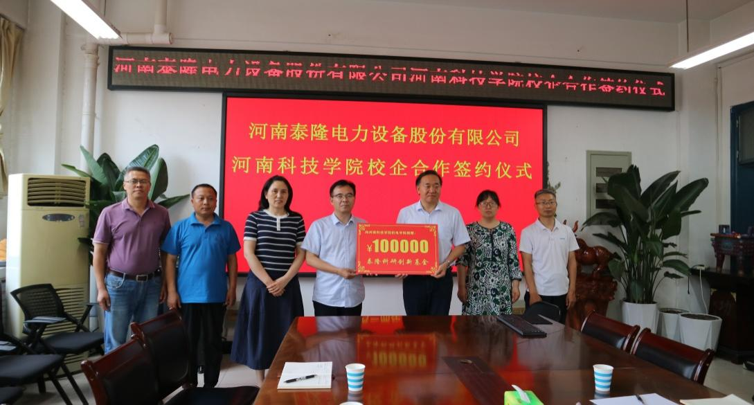6月17日下午,泰隆电力创新基金捐赠仪式在我校机电学院4304会议室举行。新乡市高新区管委会副主任史玉华,河南泰隆电力设备股份有限公司董事长王红刚、副总经理王小辉、研发中心副主任寇书瑜以及营销副总李福全,机电学院党政班子和教师代表参加仪式。仪式由机电学院院长聂福全主持。