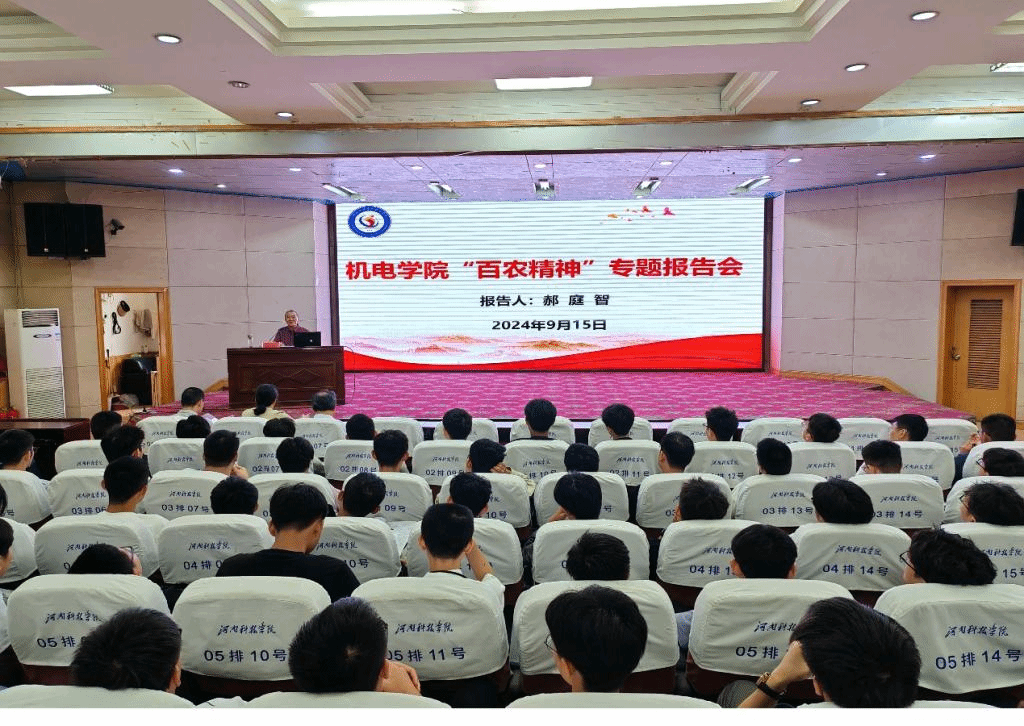 为进一步挖掘、弘扬和传承好“百农精神”,9月15日上午,机电学院在图教201举行“百农精神”专题报告会,报告会邀请原机电学院党委书记郝庭智主讲。学院党政领导,全体辅导员和机电学院2024级学生参加了会议。报告会由院党委书记张雅凌主持。