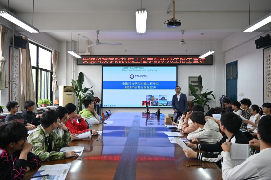 北京建筑大学机电与车辆工程学院车辆工程系主任周素霞教授围绕学院简介、学科专业与科研、科研基地与平台、学习前景与学术交流四个方面展开了宣讲;安徽科技学院机械工程学院研究生秘书彭正围绕学院简介、师资与科研、奖助体系三个方面展开了宣讲。在宣讲互动环节,同学们咨询了关于研究生择校、专业选择、备考等问题,主讲老师针对同学们的疑惑一一进行了解答和指导,并留下了联系方式。
