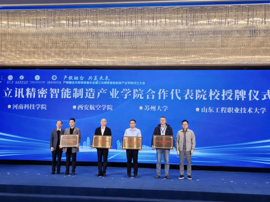 11月28日,产教融合共同体首届年会暨立讯精密智能制造产业学院成立大会在江苏昆山召开,高校及行业龙头企业代表参会。同时,我校教务处、机电学院作为立讯精密智能制造产业学院合作院校代表出席大会。