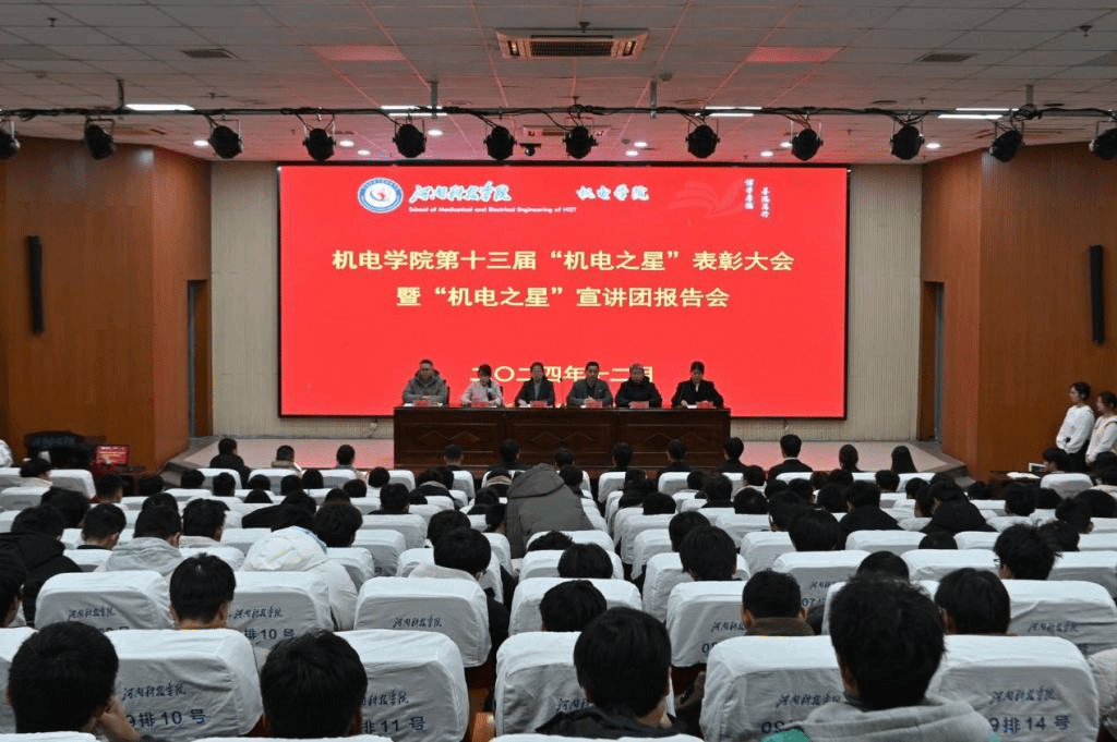 12月23日下午,机电学院第十三届“机电之星”表彰大会暨“机电之星”宣讲团报告会在新图书馆一楼报告厅举行。我院党政领导班子,全体辅导员,第十三届“机电之星”及学生代表300余人参加。会议由团委书记刘颖主持。