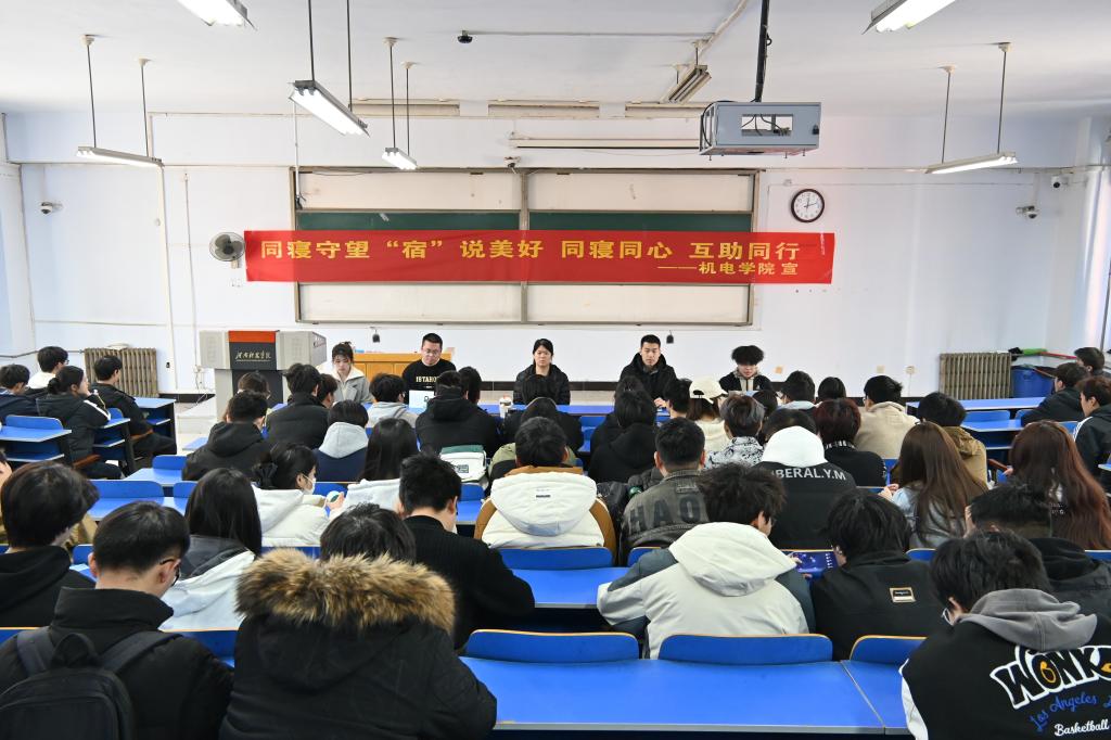 为进一步发挥学生宿舍育人阵地作用,展现当代大学生精神风貌,创新学生宿舍文化建设,提升以文化人、以文育人实效,3月17日中午,机电学院在4号楼合二教室举办了第一届以“同寝守望‘宿’说美好”为主题的宿舍文化节启动仪式。学院全体辅导员,团委和学生会成员、2024级和2023级宿舍长共计180余人参加了仪式。