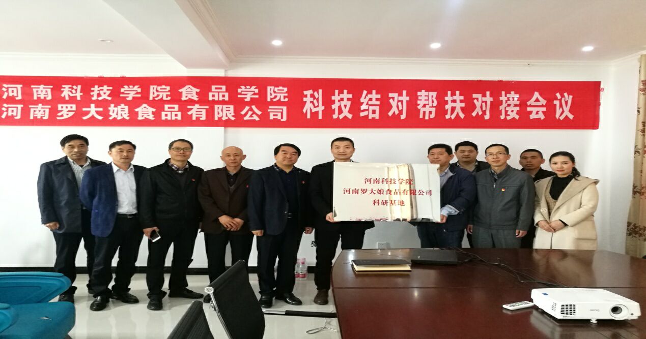 4月29日上午,食品学院党政领导、专家教授一行到商水县河南罗大娘食品有限公司开展科技结对帮扶对接暨科研基地授牌仪式。参加对接活动的有商水县产业集聚区书记李伟、河南罗大娘食品有限公司董事长勾付友、总经理任其成等人,对接仪式由食品学院党委书记李波主持。