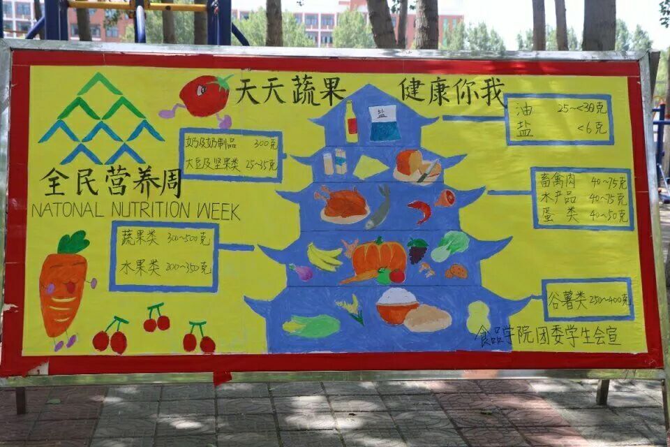 每年5月的第三周是“全民营养周” ,为响应中国营养学会倡议的“全民营养周”行动,贯彻落实《“健康中国2030”规划纲要》和《国民营养计划(2017-2030年)》,坚持以人民健康为中心、普及营养健康知识,提高公众对平衡膳食原则认识的具体实践,食品学院于5月20日~24日开展了以“健康中国,营养先行”为口号,“合理膳食,天天蔬果,健康你我”为主题的全民营养周活动。
