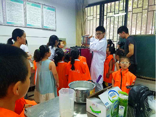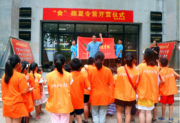 “食▪趣”夏令营是由国务院食品安全委员会办公室指导,教育部食品科学与工程类教学指导委员会和中国营养保健食品协会主办的暑期社会实践活动。河南科技学院食品学院作为全国20余所食品类专业高校承办单位之一,7月8号下午,在办公楼举行了“大学生食品安全与营养中国行”之“食▪趣”夏令营开营仪式。食品学院团委书记杨胜利以及37名儿童参与了此次活动。