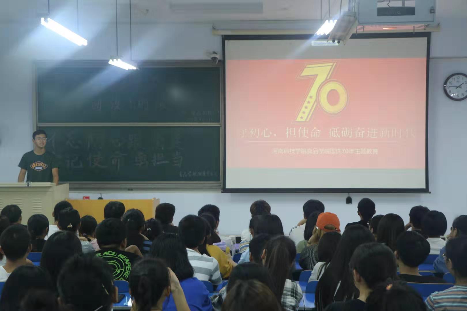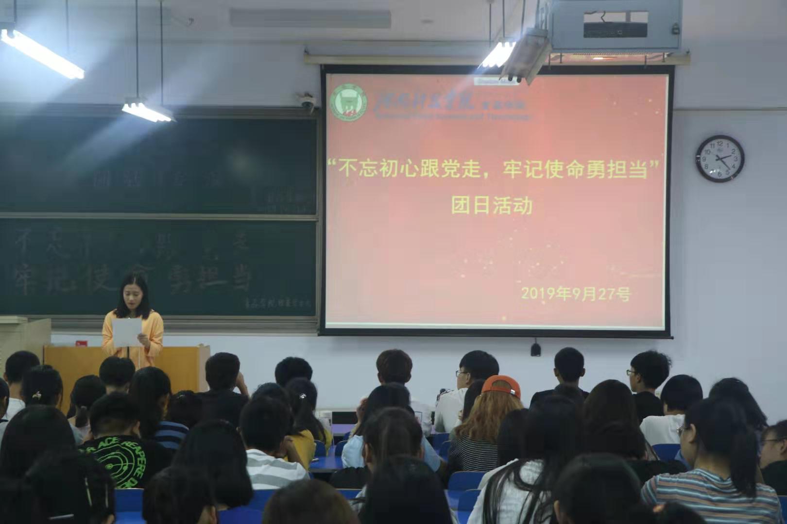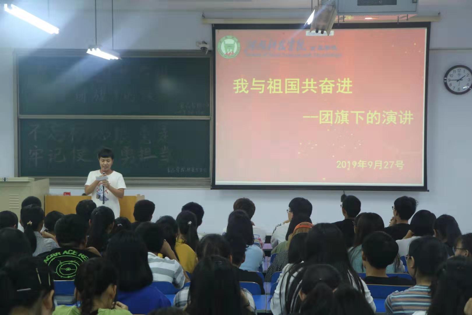 大力唱响礼赞新中国、奋进新时代的青春主旋律,为响应学校号召,9月27日中午,食品学院开展“我与祖国共奋进——团旗下的演讲”特别主题团日活动。2019级学生代表出席此次活动。活动由董天赐主持。