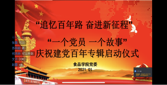 丹青写春秋,百年正风华。为庆祝中国共产党成立100周年,讴歌伟大的党带领人民取得翻天覆地的变化和成就,食品学院党委于1月27日上午10:00,利用钉钉平台开展了“追忆百年路,奋进新征程”——“一个党员,一个故事”庆祝建党百年专辑启动仪式。学院党政领导和各支部书记参加了此次仪式。仪式由学院党委副书记刘克平主持。