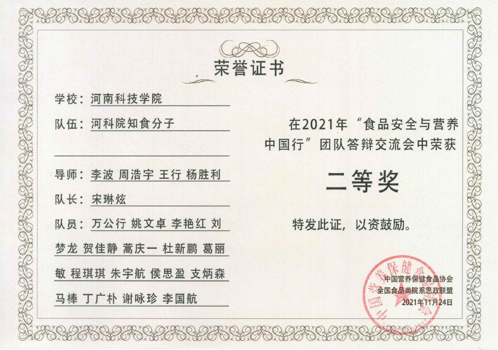 11月21日晚,全国大学生“食品安全与营养中国行”团队答辩交流会在线上顺利举办。河南科技学院与来自全国21所高校的22支队伍,进入了最后的答辩环节,最终,我院参赛队伍经过激烈角逐荣获二等奖。