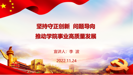 本次宣讲活动,李波以《坚持守正创新、问题导向,推动学院事业高质量发展》为题,从“学习理解党的二十大精神”和“坚持守正创新、问题导向,推动学院事业高质量发展”两个方面,全面准确深入宣讲了党的二十大提出的重大理论观点、重大方针政策、重大工作部署,并结合工作实际,提出要坚持守正创新,坚持问题导向,将党的二十大精神融入学院事业发展中,推动学院事业高质量发展。