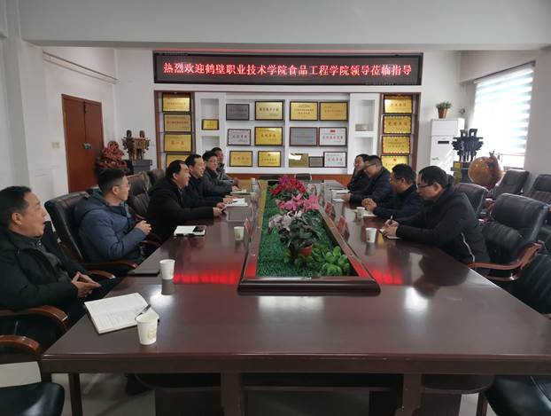 2月21日上午,鹤壁职业技术学院食品工程学院副院长(主持工作)王跃强、副书记(主持工作)葛培运、党政综合办公室主任王永刚、教学科研办公室主任许真一行4人莅临食品学院考察交流。食品学院党委书记李波,院长李光磊,副院长张令文、郭延成,曾挂职该院副院长的徐贵华博士等参加了交流会。