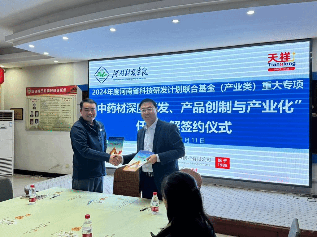 随后项目负责人高海燕和新乡天祥(集团)药业有限公司总经理徐明举行了“中药材深度开发、产品创制与产业化”项目任务分解协议书签字仪式。
