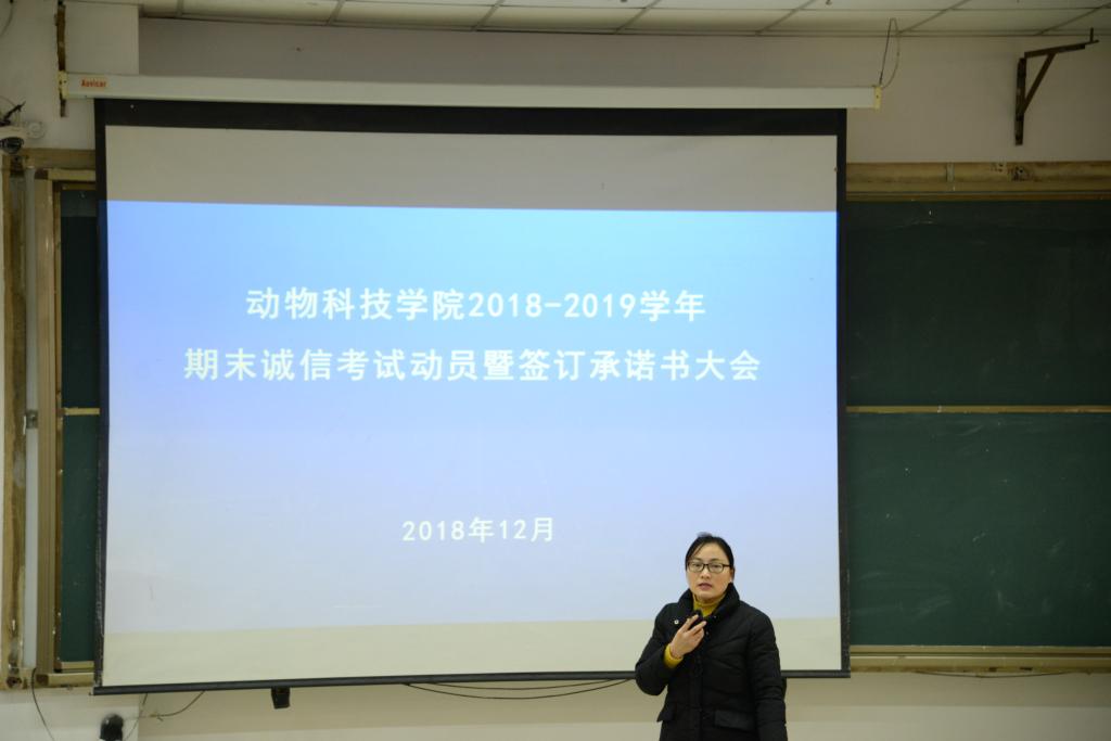 期末将至,为了营造良好的考试氛围,我院于12月29日在0#4针对全体18级新生召开诚信考试动员暨诚信考试承诺书签订大会。动物科技学院团委书记郑素玲和全体18级学生代表参加。