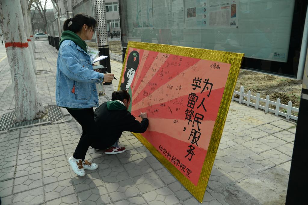 3月5日早上,10余名动物科技学院的青年志愿者来到华兰大道新中大道路口,帮助交警维持十字路口交通秩序,引导行人遵守交通规则,按照红绿灯规范行驶,让文明出行深植人心。5日下午,动物科技学院组织学生对责任区进行打扫,同学们不惧严寒,干劲十足,对所负责的卫生区认真负责,不怕苦不怕累,充分发扬了新时代青年模范带头作用,展现出了动科学生奉献助人的精神风范。与此同时,在学校零号楼旁边摆放了“‘青春心向党·建功新时代’之学习雷锋精神”宣传板,开展“雷锋精神我传承”签名活动,志愿者向来往的同学们宣传雷锋精神,并号召他们在宣传板上签名,表达自己向雷锋同志学习,培养高尚情操的决心。在动物科技学院门前,摆放了征文展板,集中展示从全体学生中征集而来的“雷锋精神”主题文章。