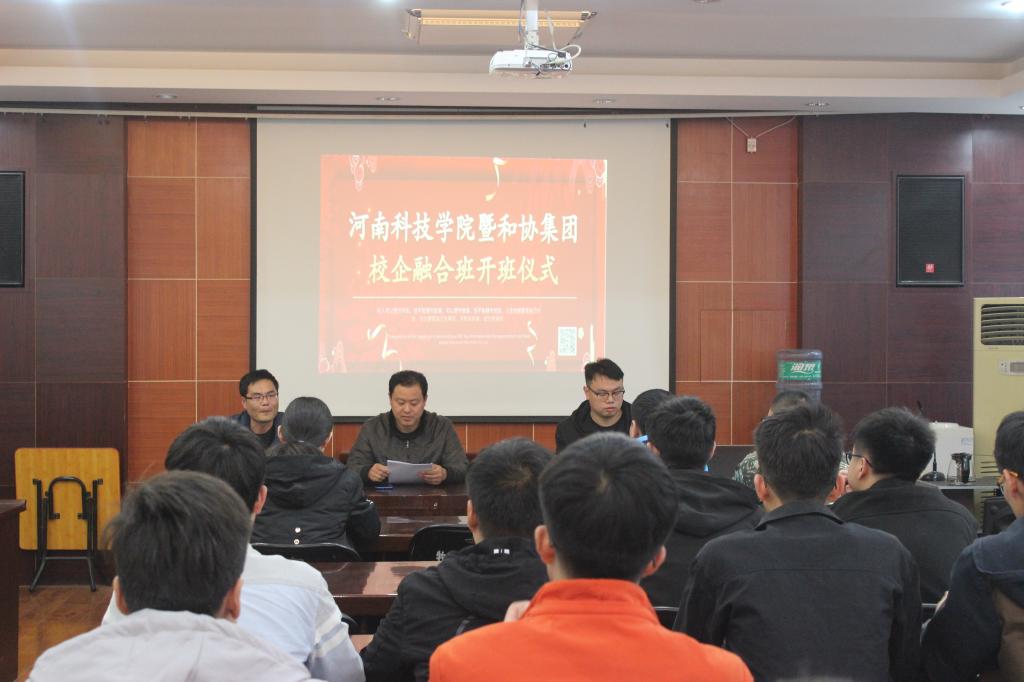 4月12日下午,河南科技学院动物科技学院与新乡和协集团合作共办的校企融合班在E302会议室正式开班。和协集团行政总监李学辉、动物科技学院团委副书记邢晓辉、机电学院教师徐俊鹏以及21名融合班学员出席本次开班仪式。开班仪式由和协集团行政总监李学辉主持。