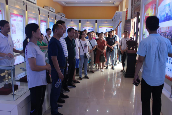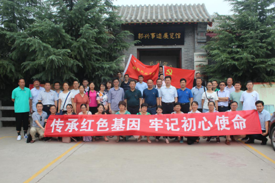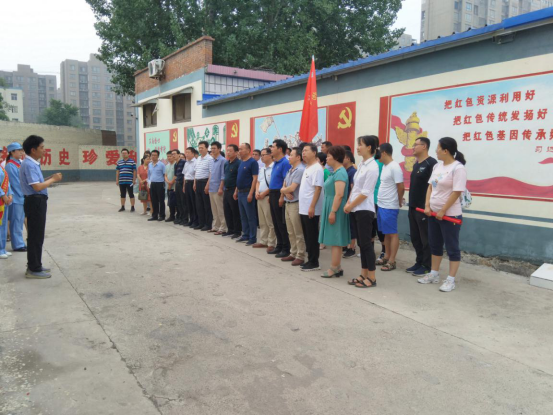 伴随着崇敬与感动,大家又来到郭兴事迹展览馆,在这里再次接受洗礼。认真聆听郭兴同志在抗日战争、解放战争以及建国后各个历史时期的英雄模范事迹,详细了解在整个抗日战争时期,日寇在辉县所犯下的滔天罪行,追忆在中国共产党的领导下,辉县人民面对日本侵略者不屈不挠的斗争历史。在纪念馆前,全体党员面对党旗,重温入党誓词。